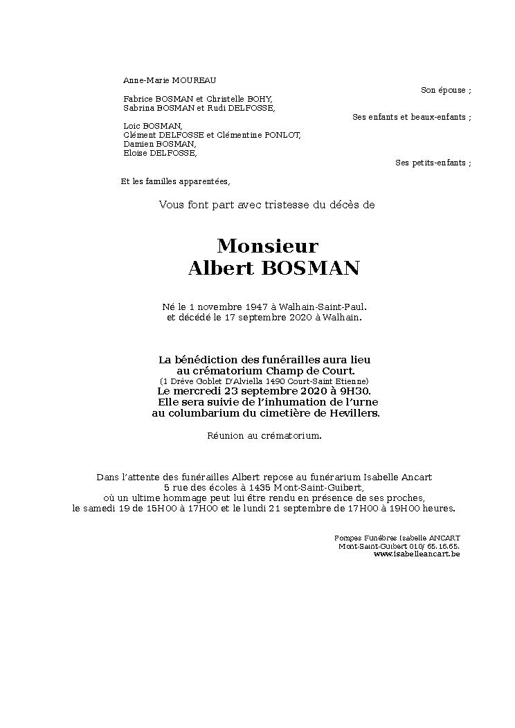 décédé à Walhain le 17 septembre 2020 à 72 ans.