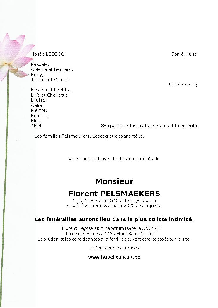 Toutes mes condoléances à Madame Josée LECOCQ, à Colette, Bernard, Louise et Célia ainsi qu'à toutes les personnes, famille et amis, touchées par le décès de Monsieur Florent PELSMAEKERS.