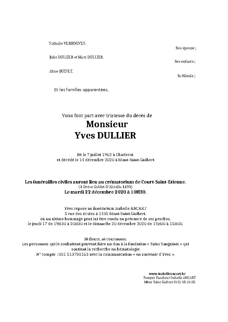 Condoléances Monsieur DULLIER Yves Né à Charleroi le 07 juillet 1962 et décédé à Mont-Saint-Guibert le 14 décembre 2020 à 58 ans.Télécharger le Faire-part (PDF) Laissez votre message de condoléances