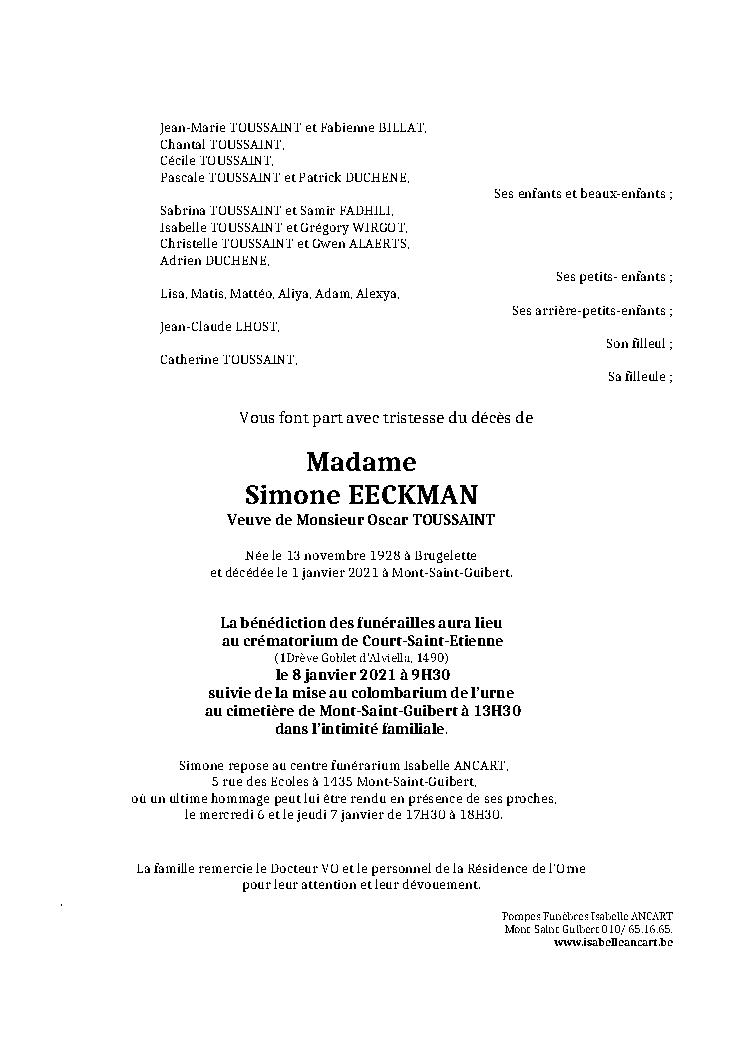Condoléances Madame EECKMAN Simone Née à Brugelette le 13 novembre 1928 et décédée à Mont-Saint-Guibert le 01 janvier 2021 à 92 ans.Télécharger le Faire-part (PDF) Laissez votre message de condoléances