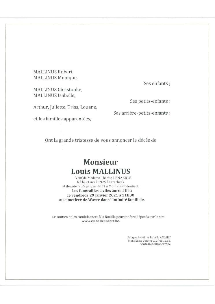 Condoléances Monsieur MALLINUS Louis Né à Etterbeek le 21 avril 1925 et décédé à Mont-Saint-Guibert le 25 janvier 2021 à 95 ans.Télécharger le Faire-part (PDF) Laissez votre message de condoléances