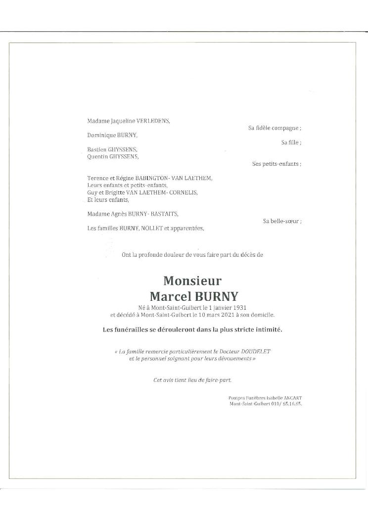 Condoléances Monsieur BURNY Marcel Né à Mont-Saint-Guibert le 01 janvier 1931 et décédé à Mont-Saint-Guibert le 10 mars 2021 à 90 ans.Télécharger le Faire-part (PDF) Laissez votre message de condoléances
