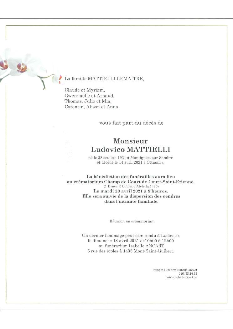 Condoléances Monsieur MATTIELLI Ludovico Né à Montignies-Sur-Sambre le 28 octobre 1931 et décédé à Ottignies le 14 avril 2021 à 89 ans.Télécharger le Faire-part (PDF) Laissez votre message de condoléances