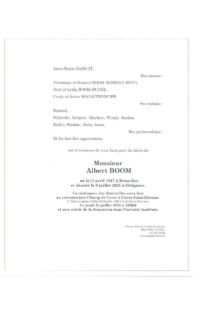 Condoléances Monsieur BOOM Albert Né à Bruxelles le 13 avril 1947 et décédé à Ottignies le 09 juillet 2021 à 74 ans.Télécharger le Faire-part (PDF) Laissez votre message de condoléances