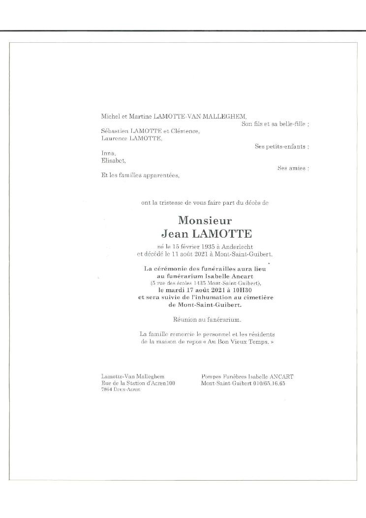 Condoléances Monsieur LAMOTTE Jean Né à Anderlecht le 15 février 1935 et décédé à Mont-Saint-Guibert le 11 août 2021 à 86 ans.Télécharger le Faire-part (PDF) Laissez votre message de condoléances