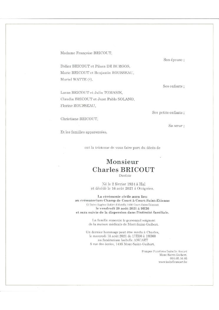 Condoléances Monsieur BRICOUT Charles Né à Hal le 02 février 1934 et décédé à Ottignies le 16 août 2021 à 87 ans.Télécharger le Faire-part (PDF) Laissez votre message de condoléances