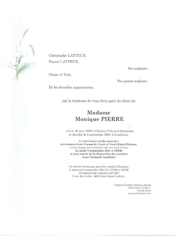 Condoléances Madame PIERRE Monique Née à Chastre-Villeroux-Blanmont le 28 juin 1939 et décédée à Gembloux le 04 septembre 2021 à 82 ans.Télécharger le Faire-part (PDF) Laissez votre message de condoléances