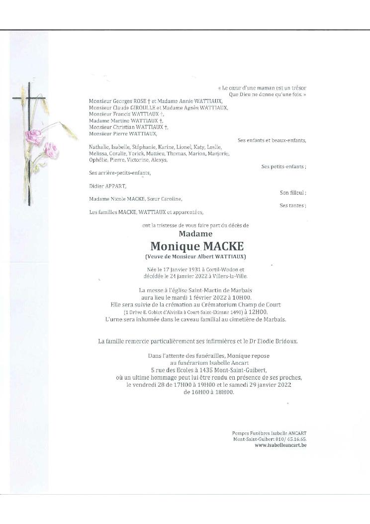 Condoléances Madame MACKE Monique Née à Cortil-Wodon le 17 janvier 1931 et décédée à Marbais le 24 janvier 2022 à 91 ans.Télécharger le Faire-part (PDF) Laissez votre message de condoléances