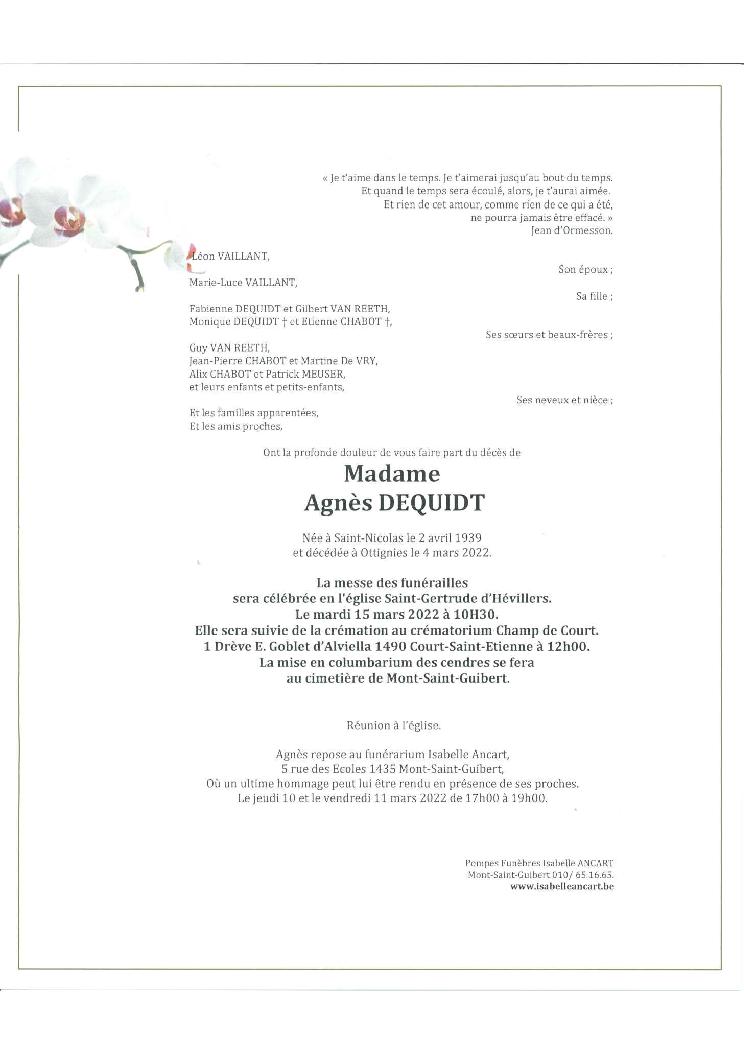 Condoléances Madame DEQUIDT Agnès Née à Saint-Nicolas le 02 avril 1939 et décédée à Ottignies le 04 mars 2022 à 82 ans.Télécharger le Faire-part (PDF) Laissez votre message de condoléances