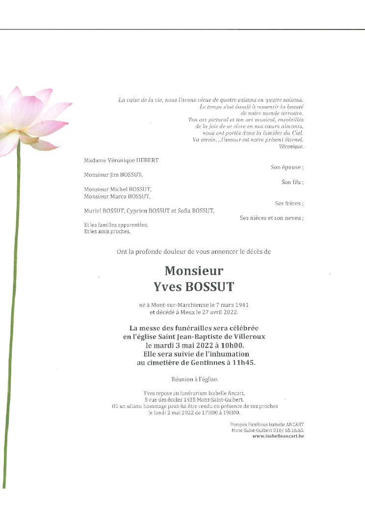 Condoléances Monsieur BOSSUT Yves Né à Mont-Sur-Marchienne le 07 mars 1941 et décédé à Meux le 27 avril 2022 à 81 ans.Télécharger le Faire-part (PDF) Laissez votre message de condoléances