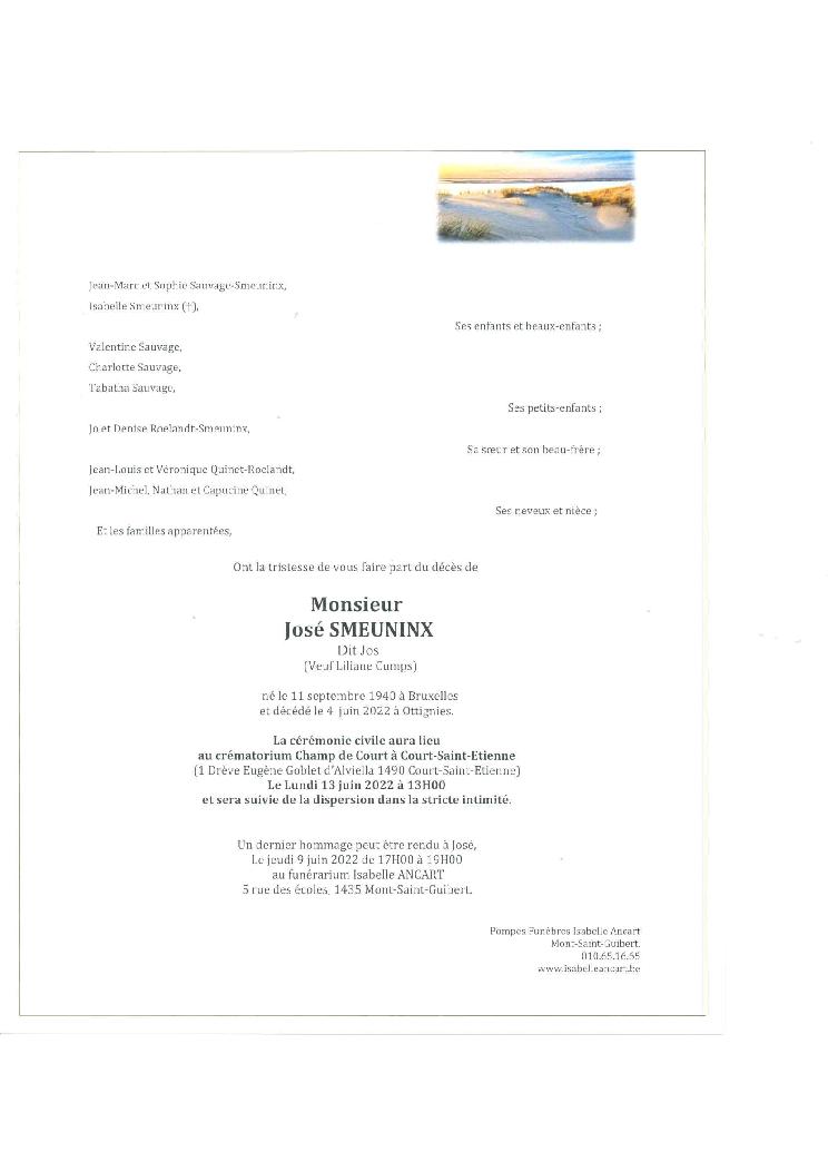 Condoléances Monsieur SMEUNINX José Né à Bruxelles le 11 septembre 1940 et décédé à Ottignies le 04 juin 2022 à 81 ans.Télécharger le Faire-part (PDF) Laissez votre message de condoléances