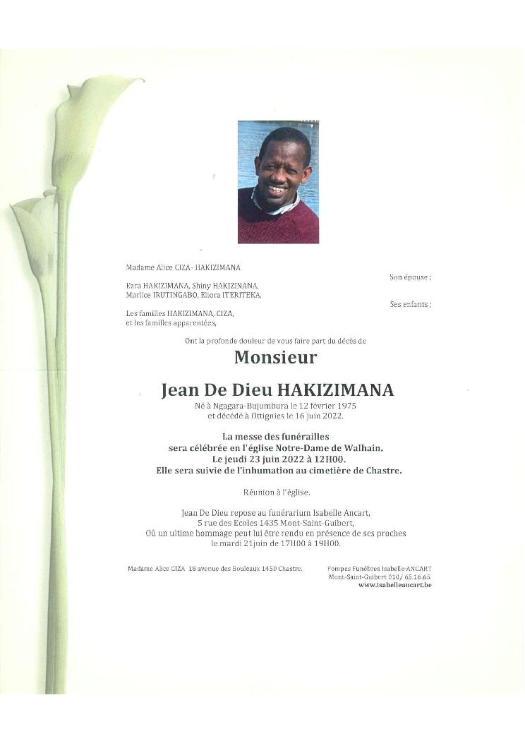 Nous gardons un beau souvenir de Jean-de-dieu.Nous sommes peiné par sa mort.Jésus nous donne l espoir de la résurrection..Mettons notre confiance en Dieu.Lui seul peux nous sauver.Amitiés à vous.Assemblée chrétienne de Wavre
