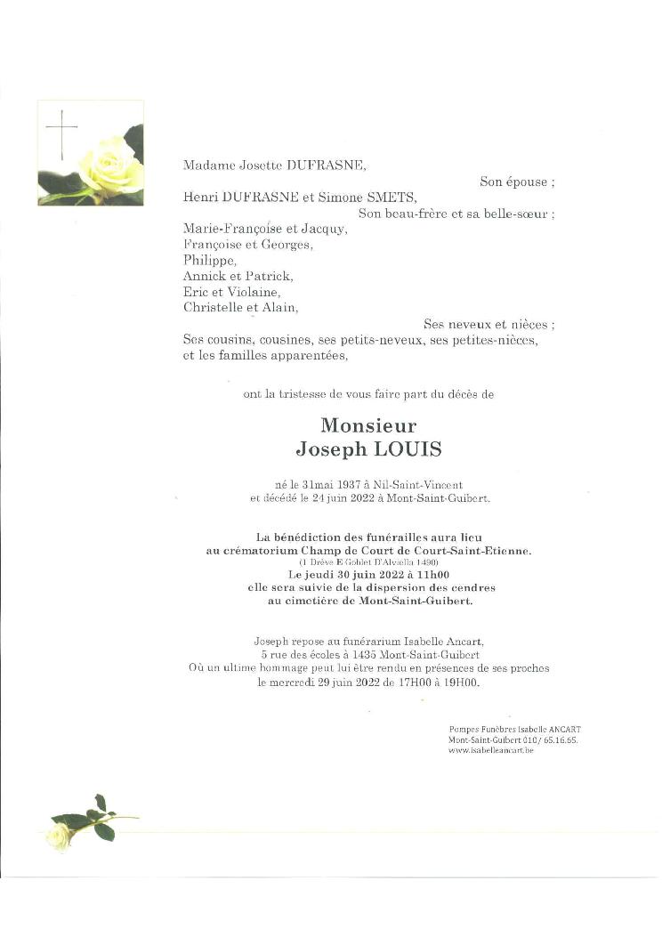 Condoléances Monsieur LOUIS Joseph Né à Nil-Saint-Vincent-Saint-Martin le 31 mai 1937 et décédé à Mont-Saint-Guibert le 24 juin 2022 à 85 ans.Télécharger le Faire-part (PDF) Laissez votre message de condoléances