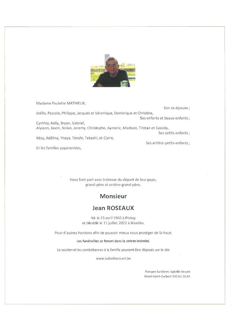 Condoléances Monsieur ROSEAUX Jean Né à Poissy le 15 avril 1942 et décédé à Nivelles le 11 juillet 2022 à 80 ans.Télécharger le Faire-part (PDF) Laissez votre message de condoléances