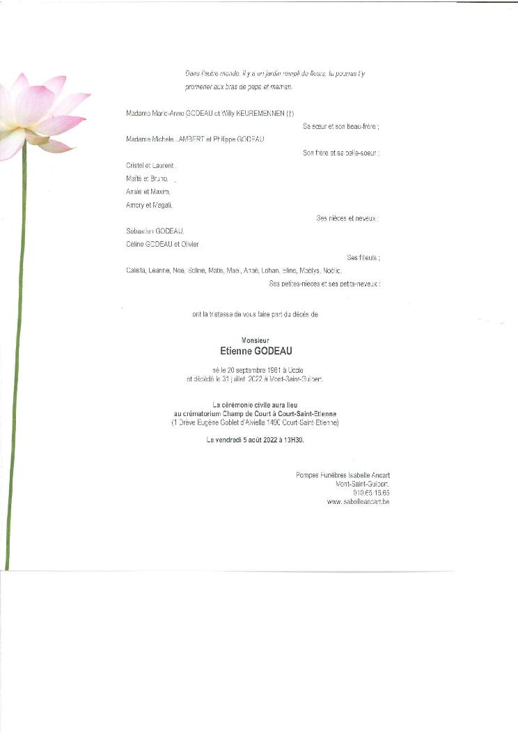 Condoléances Monsieur GODEAU Etienne Né à Uccle le 20 septembre 1961 et décédé à Mont-Saint-Guibert le 31 juillet 2022 à 60 ans.Télécharger le Faire-part (PDF) Laissez votre message de condoléances