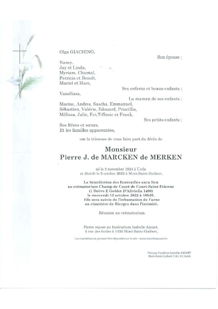 Condoléances Monsieur DE MARCKEN DE MERKEN Pierre Né à Uccle le 02 novembre 1934 et décédé à Mont-Saint-Guibert le 05 octobre 2022 à 87 ans.Télécharger le Faire-part (PDF) Laissez votre message de condoléances