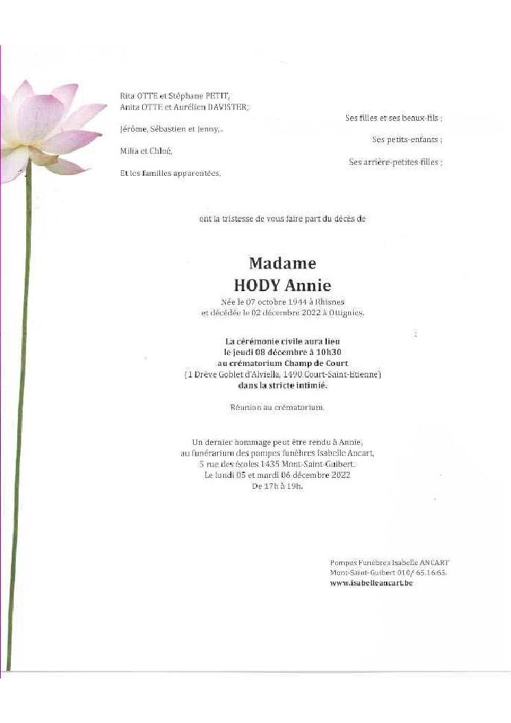 Condoléances Madame HODY Annie Née à Rhisnes le 07 octobre 1944 et décédée à Ottignies le 02 décembre 2022 à 78 ans.Télécharger le Faire-part (PDF) Laissez votre message de condoléances