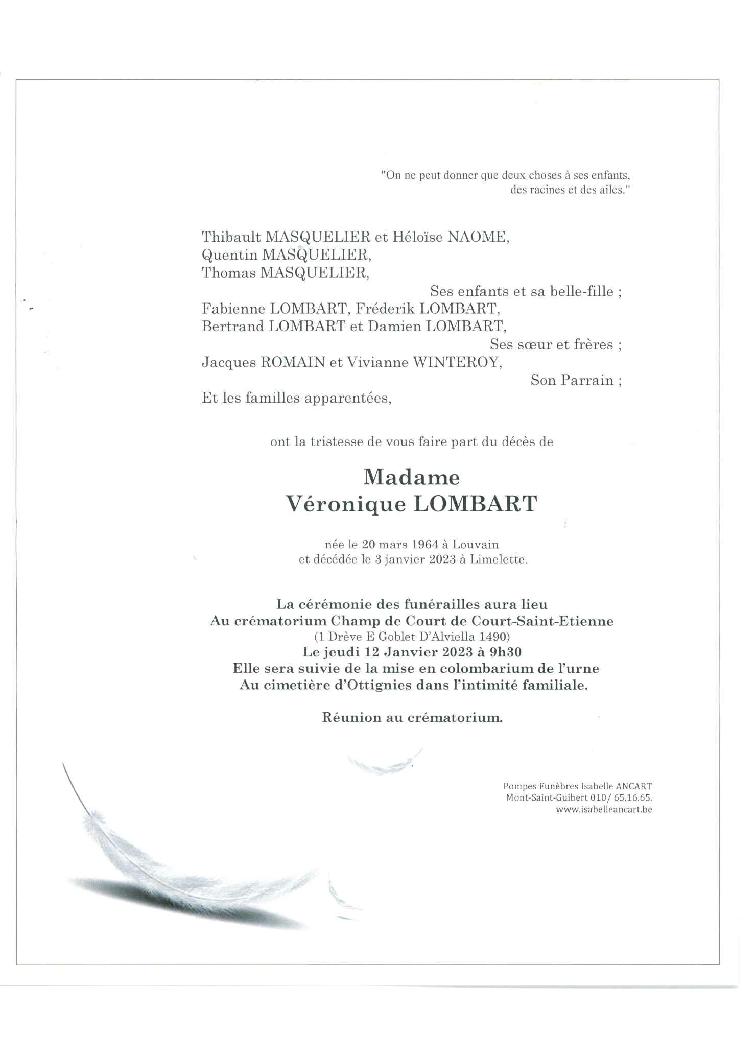 Au nom de la conférence de Saint Vincent de Paul de Limelette, dont elle faisait partie en tant que bénévole, nous vous présentons nos très sincères condoléances pour le décès de Véronique. Nous garderons d'elle son sourire et sa bienveillance vis à vis de tous les bénéficiaires. Sincères amitiés.