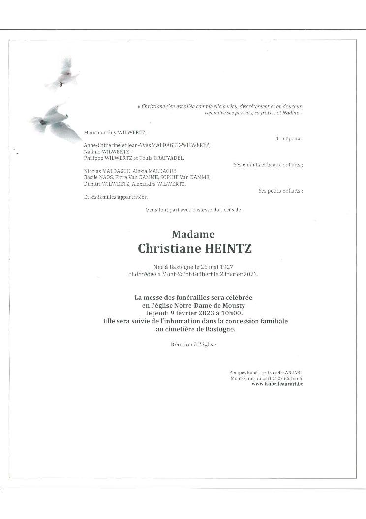 Condoléances Madame HEINTZ Christiane Née à Bastogne le 26 mai 1927 et décédée à Mont-Saint-Guibert le 02 février 2023 à 95 ans.Télécharger le Faire-part (PDF) Laissez votre message de condoléances