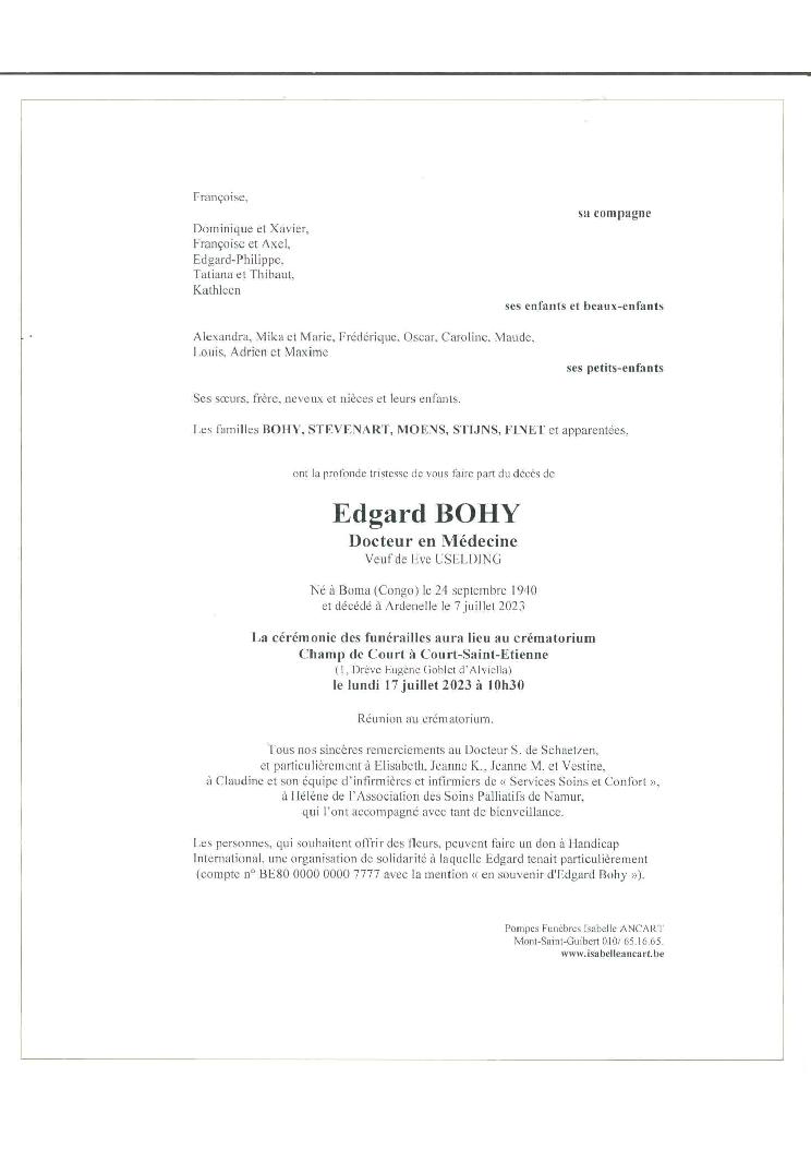 Recevez mes sincères condoléances .Je suis présente avec vous par la pensée dans ces moments difficiles. Je garde des bons souvenirs des années passées à la clinique SAINT PIERRE sous la direction de Monsieur BOHY.