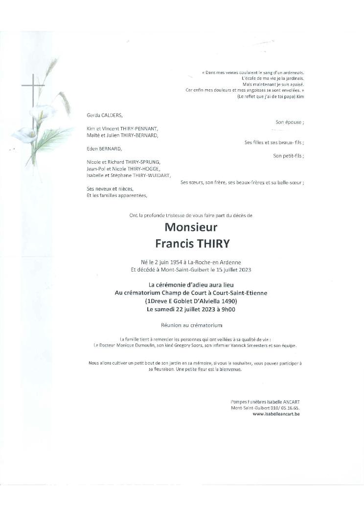 C'est avec tristesse que nous apprenons le décès de Francis. Nous te présentons nos très sincères condoléances et souhaitons beaucoup de courage.