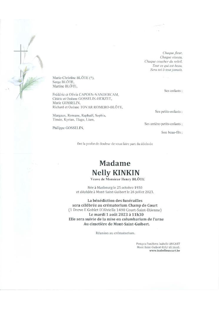 Condoléances Madame KINKIN Nelly Née à Masbourg le 25 octobre 1930 et décédée à Mont-Saint-Guibert le 26 juillet 2023 à 92 ans.Télécharger le Faire-part (PDF) Laissez votre message de condoléances