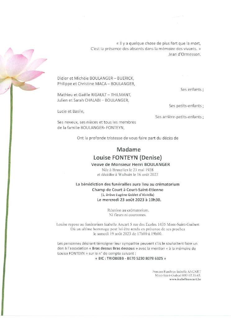 Condoléances Madame FONTEYN Louise Denise Née à Bruxelles le 23 mai 1928 et décédée à Walhain-Saint-Paul le 16 août 2023 à 95 ans.Télécharger le Faire-part (PDF) Laissez votre message de condoléances