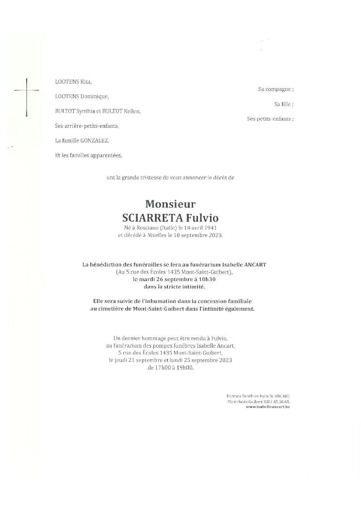 Condoléances Monsieur SCIARRETA Fulvio Né à Rosciano (Italie) le 14 avril 1941 et décédé à Nivelles le 18 septembre 2023 à 82 ans.Télécharger le Faire-part (PDF) Laissez votre message de condoléances