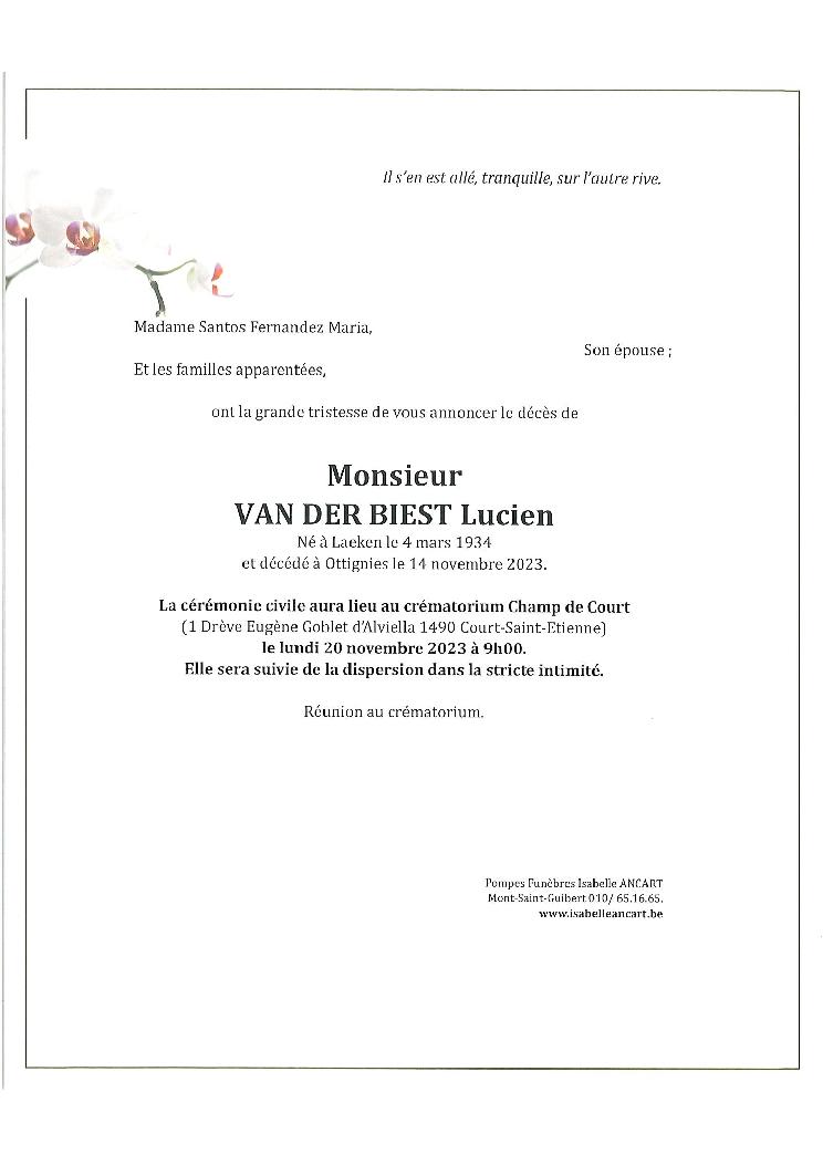 Condoléances Monsieur VAN DER BIEST Lucien Né à Laeken le 04 mars 1934 et décédé à Ottignies le 14 novembre 2023 à 89 ans.Télécharger le Faire-part (PDF) Laissez votre message de condoléances