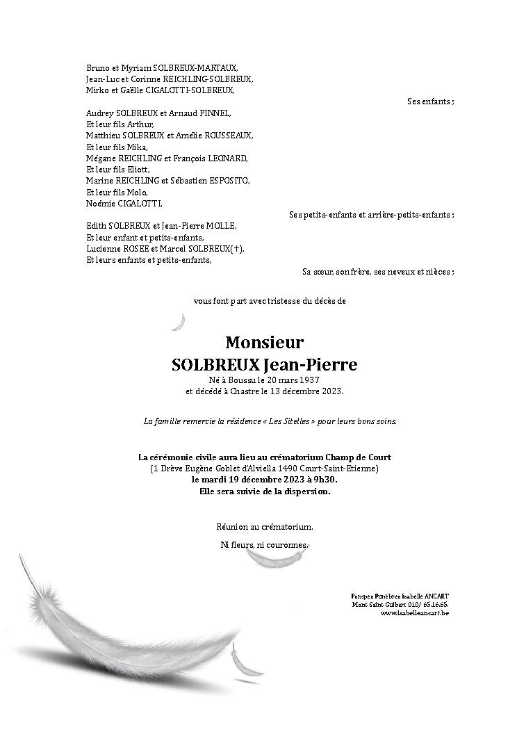 Nous ne saurons malheureusment pas être présents le jour des funérailles. Mais, néanmoins, vous pouvez toujours compter sur notre soutien et amitié.