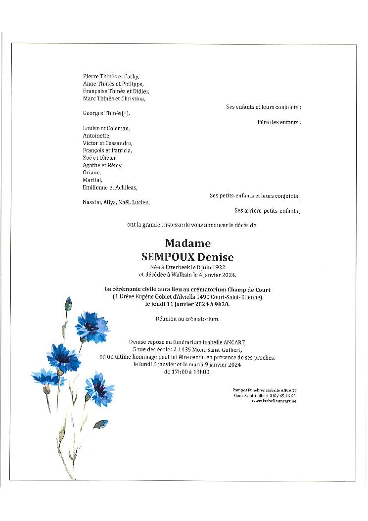 Condoléances Madame SEMPOUX Denise Née à Etterbeek le 08 juin 1932 et décédée à Walhain le 04 janvier 2024 à 91 ans.Télécharger le Faire-part (PDF) Laissez votre message de condoléances