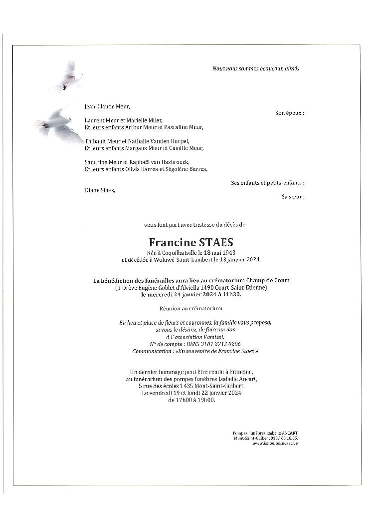 Condoléances Madame STAES Francine Née à Coquilhatville le 18 mai 1943 et décédée à Woluwe-Saint-Lambert le 13 janvier 2024 à 80 ans.Télécharger le Faire-part (PDF) Laissez votre message de condoléances