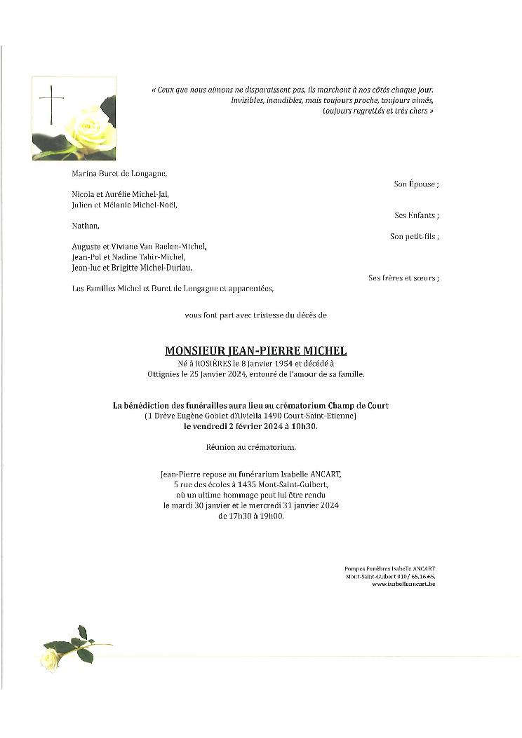 Condoléances Monsieur MICHEL Jean-Pierre Né à Rossières le 08 janvier 1954 et décédé à Ottignies le 25 janvier 2024 à 70 ans.Télécharger le Faire-part (PDF) Laissez votre message de condoléances