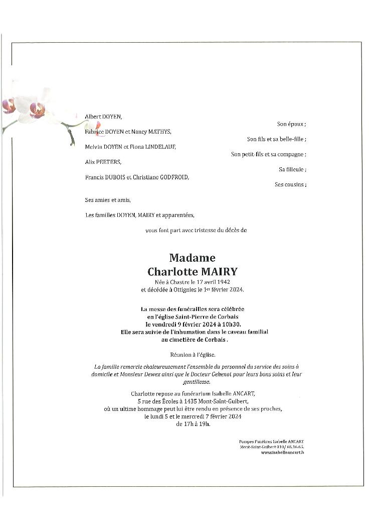 Condoléances Madame MAIRY Charlotte Née à Chastre le 17 avril 1942 et décédée à Ottignies le 01 février 2024 à 81 ans.Télécharger le Faire-part (PDF) Laissez votre message de condoléances