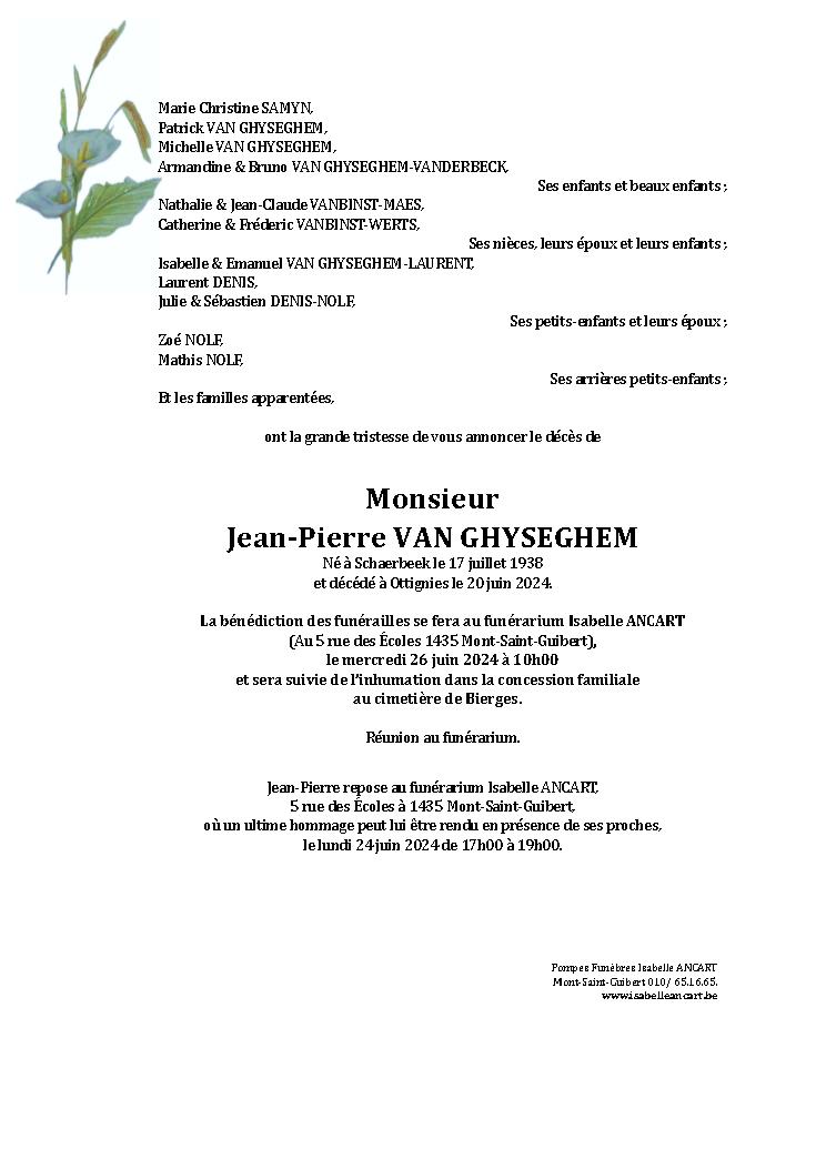 Condoléances Monsieur VAN GHYSEGHEM Jean-Pierre Né à Schaerbeek le 17 juillet 1938 et décédé à Ottignies le 20 juin 2024 à 85 ans.Télécharger le Faire-part (PDF) Laissez votre message de condoléances