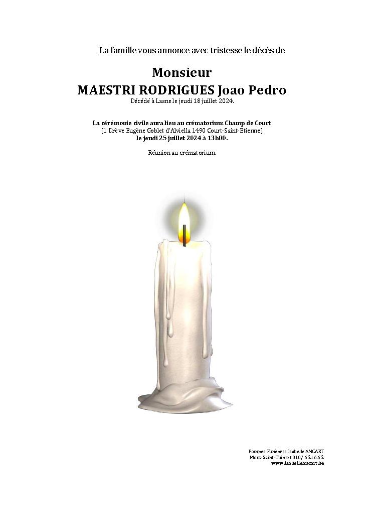Condoléances Monsieur MAESTRI RODRIGUES Joao Pedro Né à Brésil le 07 avril 1997 et décédé à Lasne le 18 juillet 2024 à 27 ans.Télécharger le Faire-part (PDF) Laissez votre message de condoléances