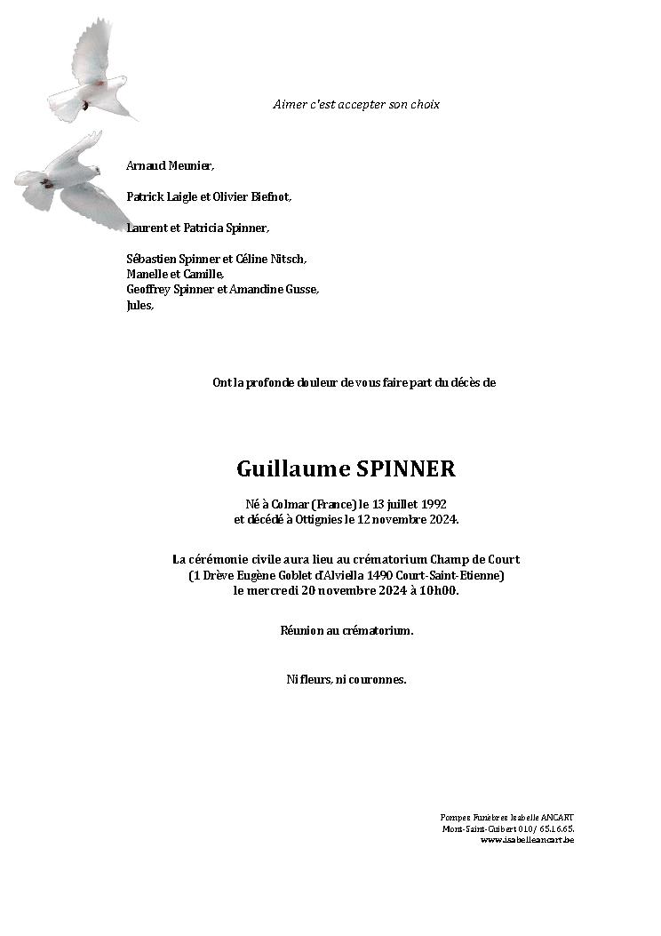Condoléances Monsieur SPINNER Guillaume Né à Colmar (France) le 13 juillet 1992 et décédé à Ottignies le 12 novembre 2024 à 32 ans.Télécharger le Faire-part (PDF) Laissez votre message de condoléances