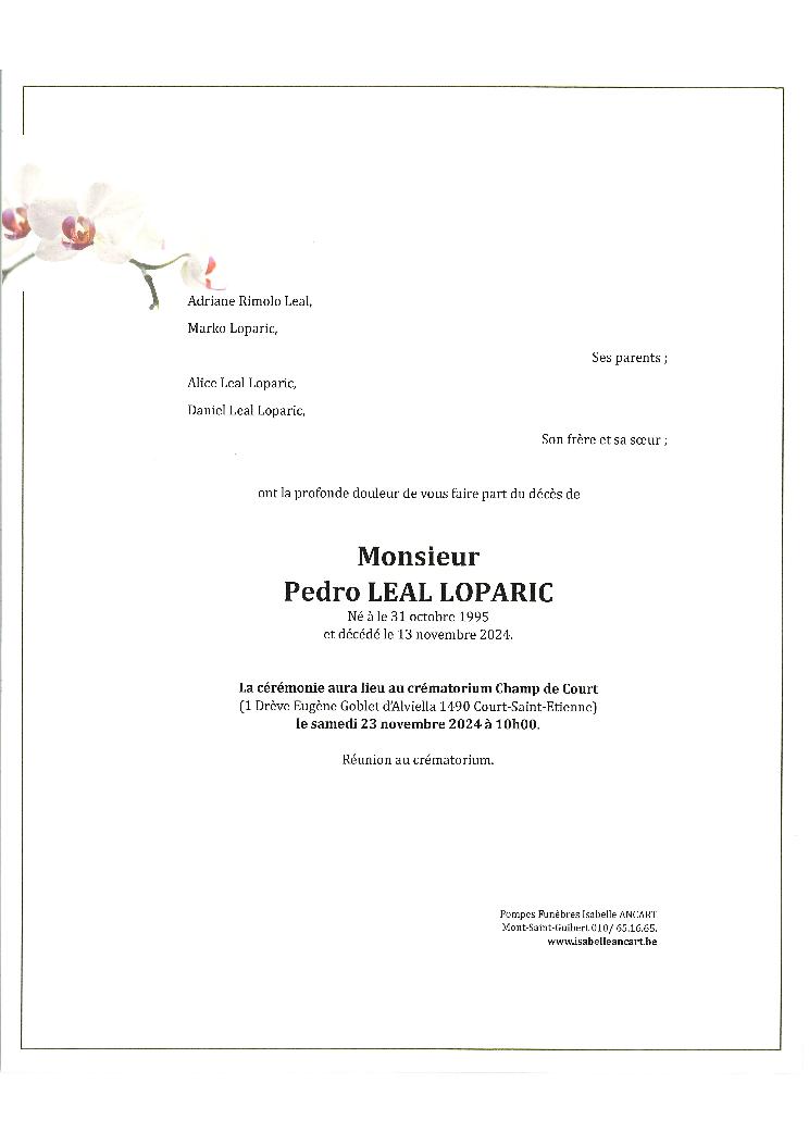 Condoléances Monsieur LEAL LOPARIC Pedro Né à Belgique le 31 octobre 1995 et décédé à Leuven le 13 novembre 2024 à 29 ans.Télécharger le Faire-part (PDF) Laissez votre message de condoléances