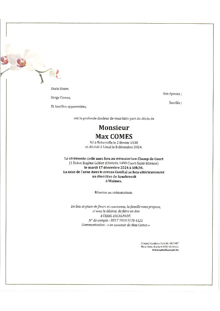 Condoléances Monsieur COMES Max Né à Robertville le 02 février 1938 et décédé à Limal le 08 décembre 2024 à 86 ans.Télécharger le Faire-part (PDF) Laissez votre message de condoléances