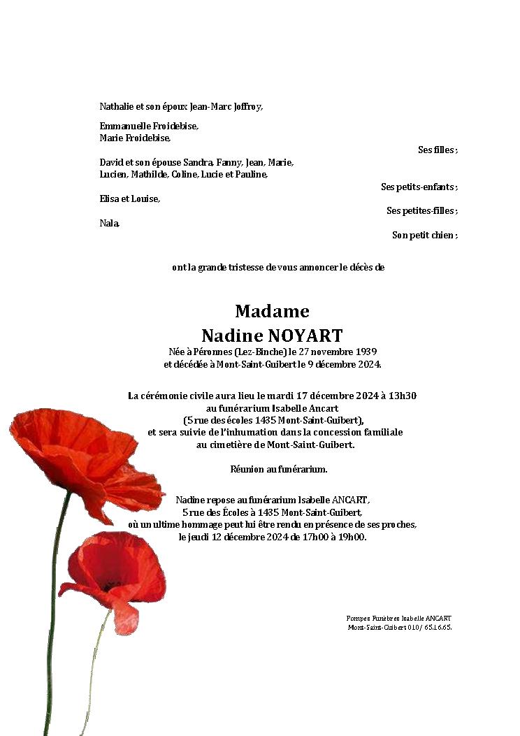 Condoléances Madame NOYART Nadine Née à Péronnes (Lez-Binche) le 27 novembre 1939 et décédée à Mont-Saint-Guibert le 09 décembre 2024 à 85 ans.Télécharger le Faire-part (PDF) Laissez votre message de condoléances