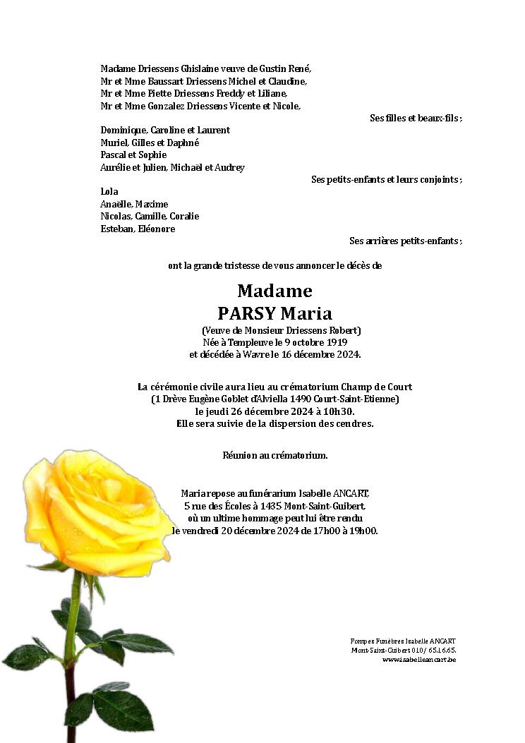 Condoléances Madame PARSY Maria Née à Templeuve le 09 octobre 1919 et décédée à Wavre le 16 décembre 2024 à 105 ans.Télécharger le Faire-part (PDF) Laissez votre message de condoléances