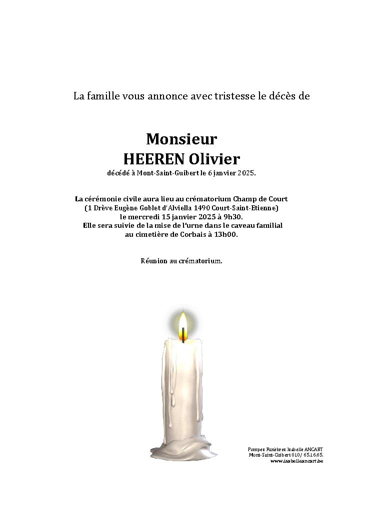 Condoléances Monsieur HEEREN Olivier Né à Belgique le 17 septembre 1981 et décédé à Mont-Saint-Guibert le 06 janvier 2025 à 43 ans.Télécharger le Faire-part (PDF) Laissez votre message de condoléances