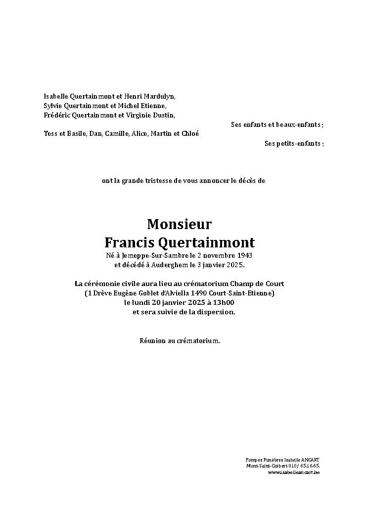 Condoléances Monsieur QUERTAINMONT Francis Né à Jemeppe-Sur-Sambre le 02 novembre 1943 et décédé à Auderghem le 03 janvier 2025 à 81 ans.Télécharger le Faire-part (PDF) Laissez votre message de condoléances