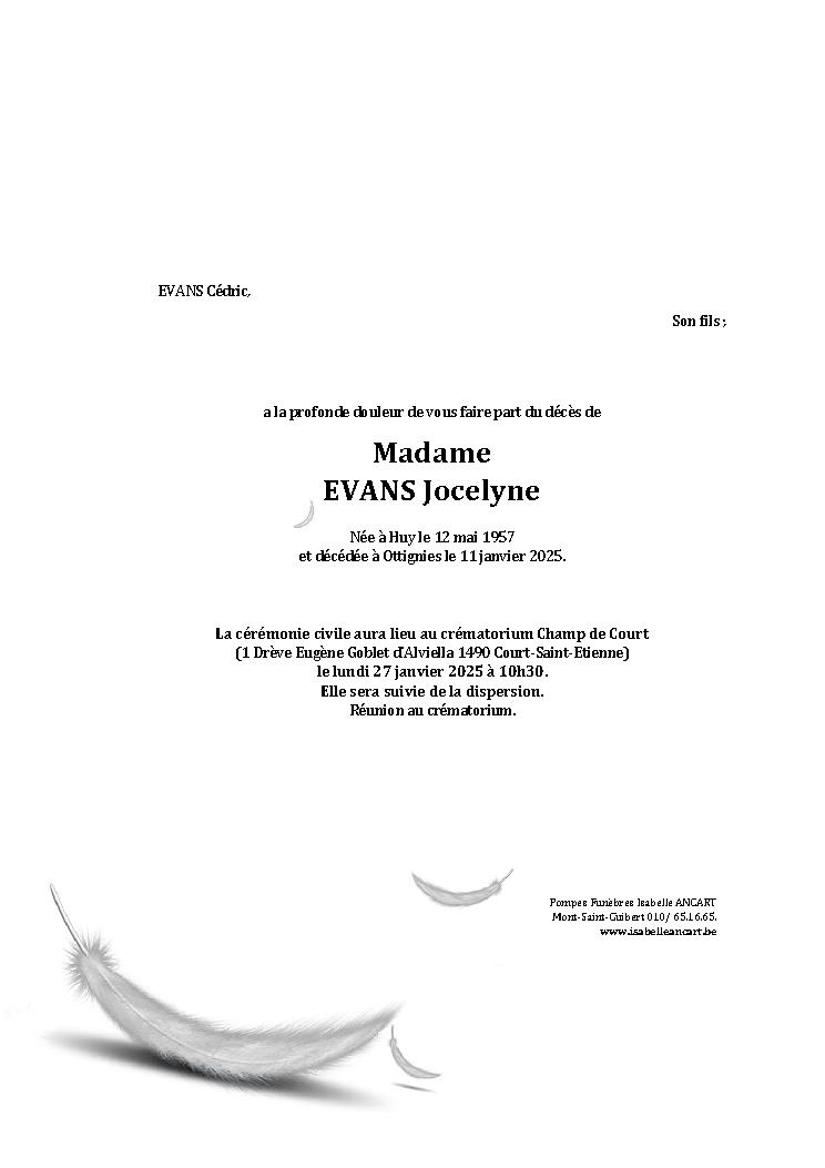 Condoléances Madame EVANS Jocelyne Née à Huy le 12 mars 1957 et décédée à Ottignies le 11 janvier 2025 à 67 ans.Télécharger le Faire-part (PDF) Laissez votre message de condoléances