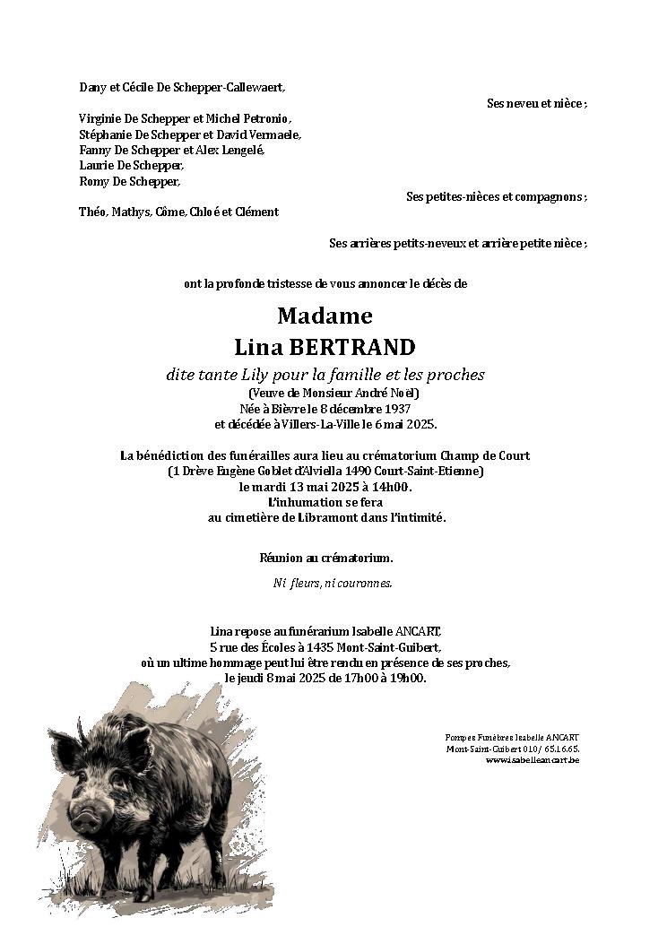 Condoléances Madame BERTRAND Lina Née à Bièvre le 08 décembre 1937 et décédée à Villers-La-Ville le 06 mai 2025 à 87 ans.Télécharger le Faire-part (PDF) Laissez votre message de condoléances