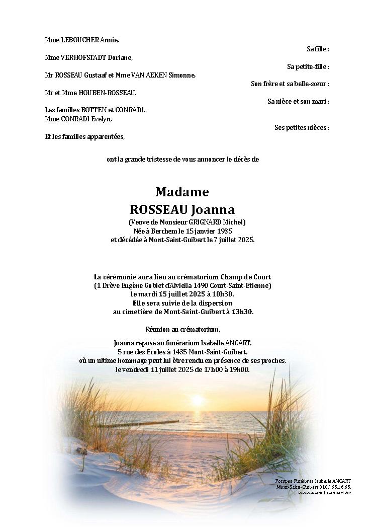 Condoléances Madame ROSSEAU Joanna Née à Berchem le 15 janvier 1935 et décédée à Mont-Saint-Guibert le 07 juillet 2025 à 90 ans.Télécharger le Faire-part (PDF) Laissez votre message de condoléances