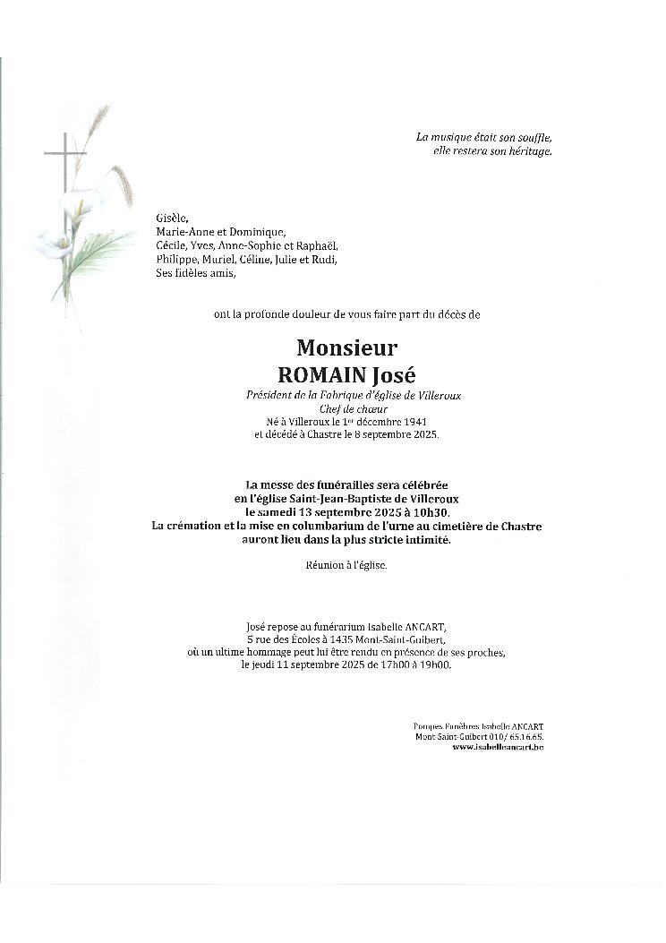 Jean et Jeanne Belge presentent à Gisèle et à toute la famille nos sincères condoléances. Nous sommes reconnaissants pour toutes les célébrations animées par José à Villeroux. beaucoup de courage à tous et toutes