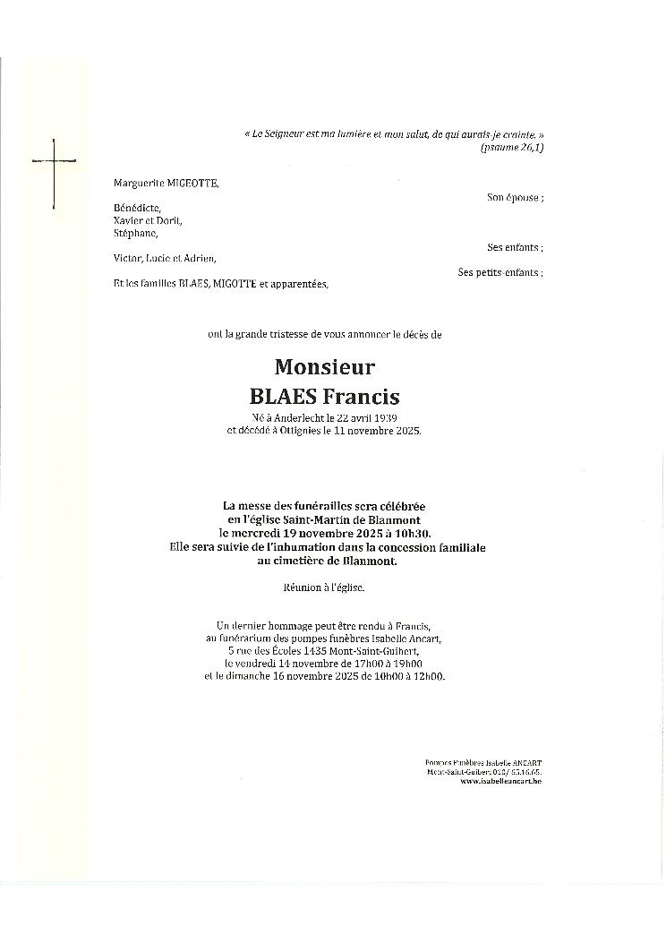 Je tiens à t'assurer de tout mon soutien en ce moment si pénible du départ de ton cher Francis. C'était un homme rayonnant , plein de bonté, ayant une très grande foi. C'était mon compagnon de chant, voix de ténor, pedant tant d'années, déjà à Beauraing, puis dans la chorale de l'UP. Je crois qu'il n'y a que la foi qui pourra t'apporter un peu de réconfort, mais c'est quand même une terrible épreuve que de perdre son époux. Je suis passé par là et je vais bien me souvenir de toi dans la prière. Amicalement