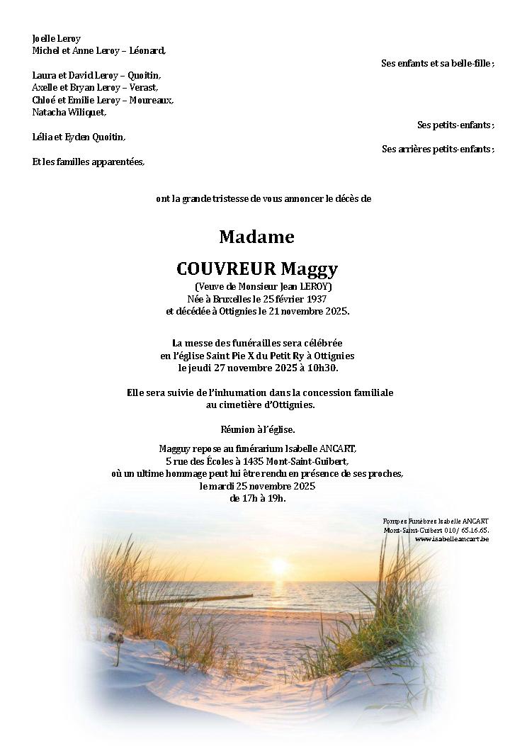 Condoléances Madame COUVREUR Maggy Née à Bruxelles le 25 février 1937 et décédée à Ottignies le 21 novembre 2025 à 88 ans.Télécharger le Faire-part (PDF) Laissez votre message de condoléances