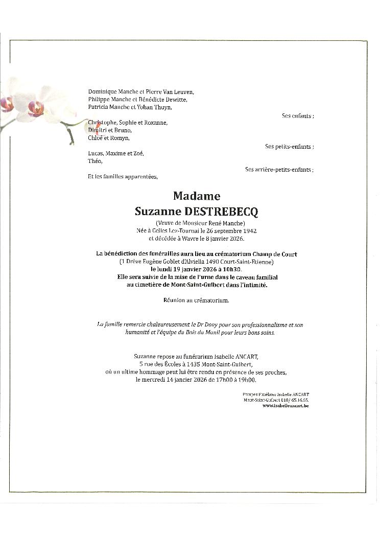 Message de DELROEUX VEUVE DESTREBECQ JACQUES Colette le 12 janvier 2026